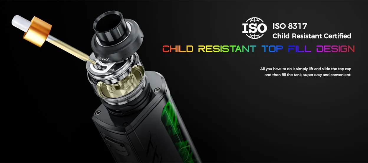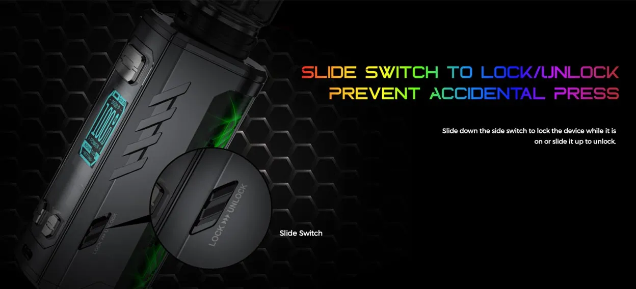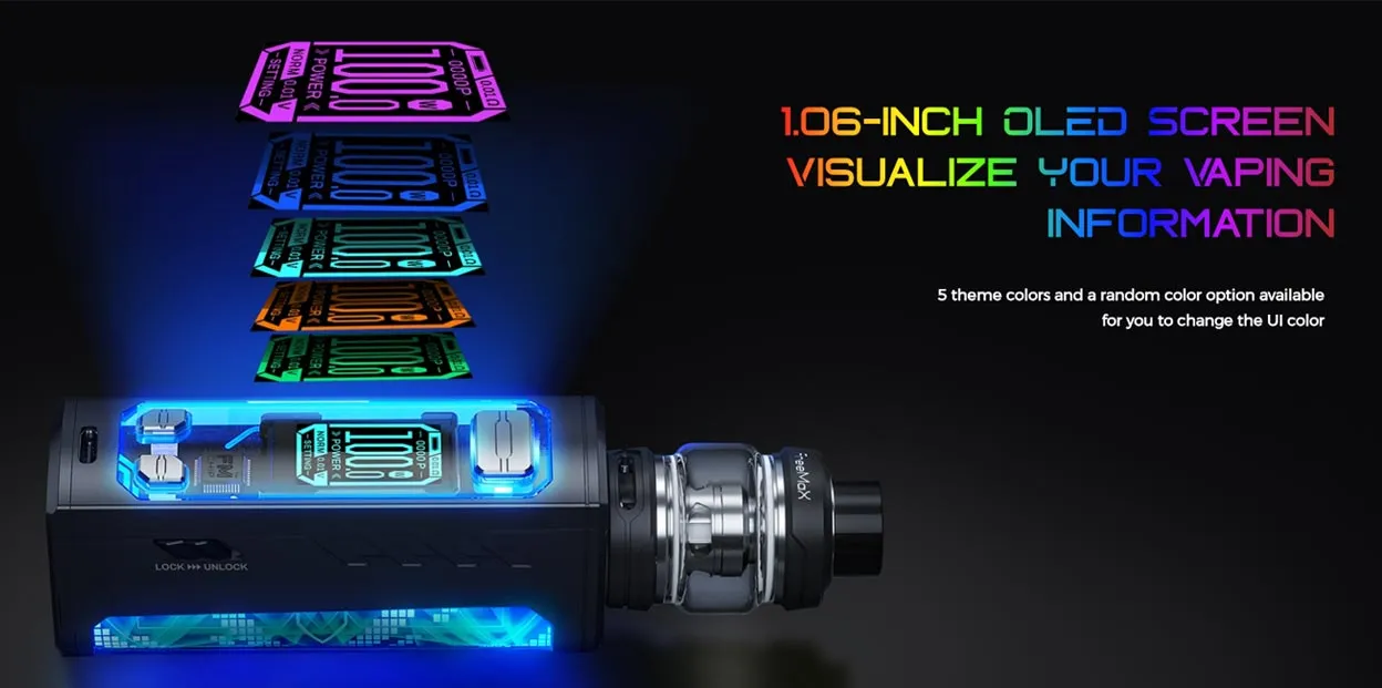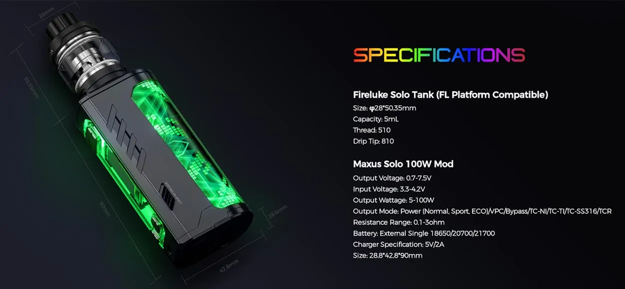 Kit consists of Fireluke Solo Tank and Maxus Solo 100W Mod, powered by an external 18650/20700/21700 battery and charged with a 5V/2A USB Type-C cable. It has a cool mood lighting design that will attract lots of attention no matter whether it’s day or night.